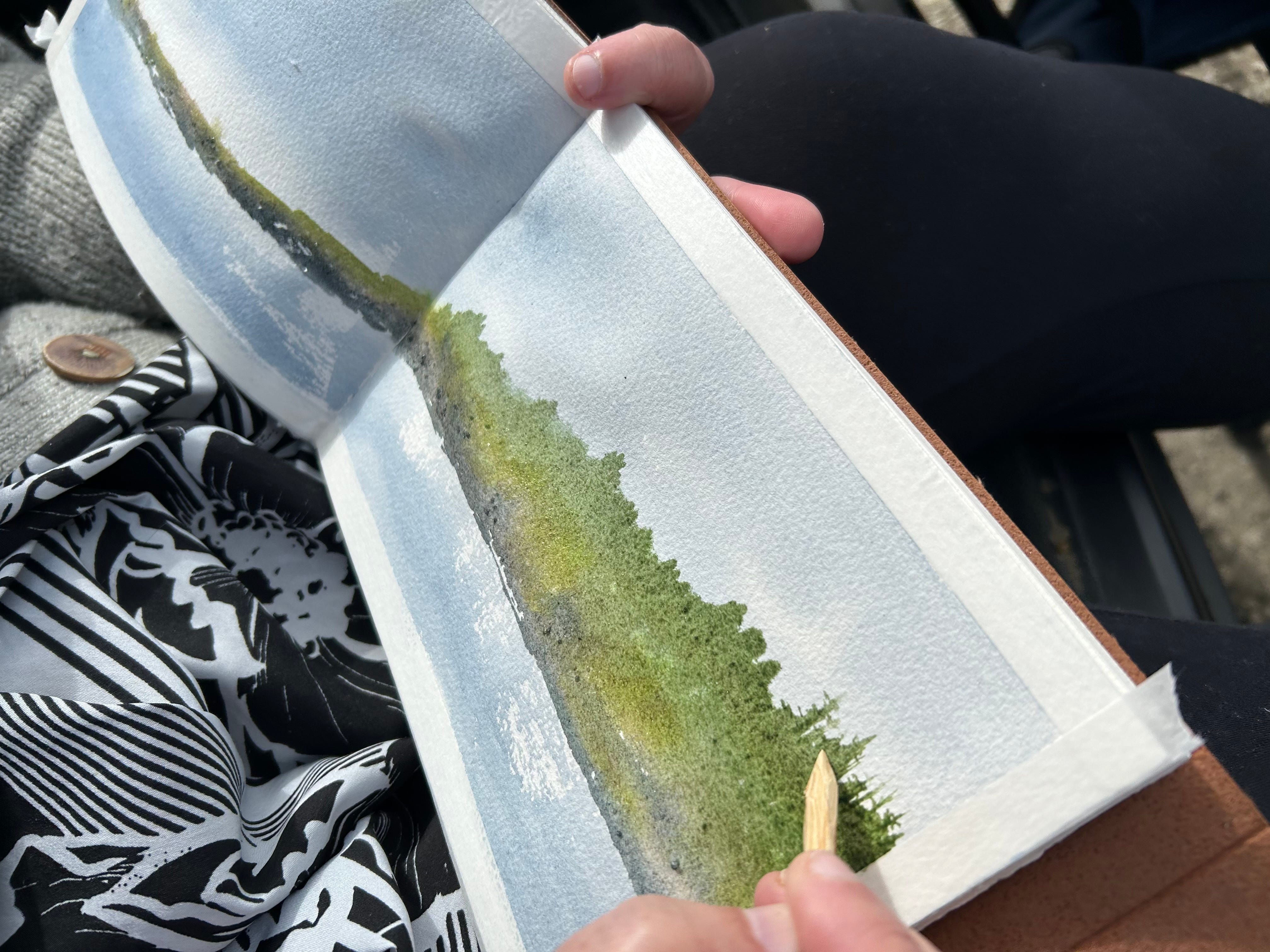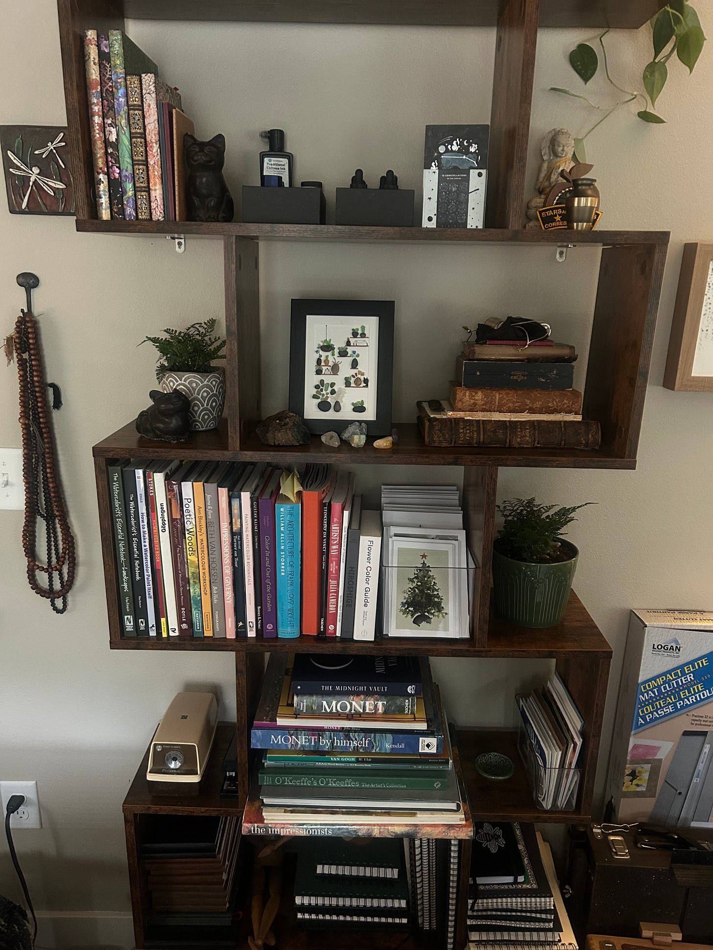Under that is my shelf of watercolor sketchbooks. This is an extensive collection and mostly filled pages. I have moody landscapes and happy meadows. Strong beautiful trees and curious cats. Galaxy skies and ocean shores. Each of these paintings is an expressions of my mind, and I know exactly what my mood was or what my “messy brain” was trying to convey. Some of the paintings were done on location, capturing a point in time with family and friends like a photograph.